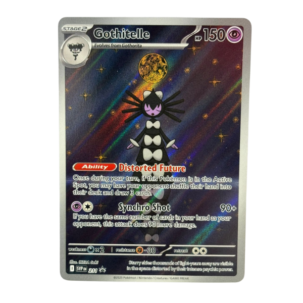 Como carta promo de Black Bolt, Gothitelle se posiciona como una rareza con encanto gótico, perfecta para quienes buscan algo distinto, poderoso y con una estética hipnótica que no pasa desapercibida.