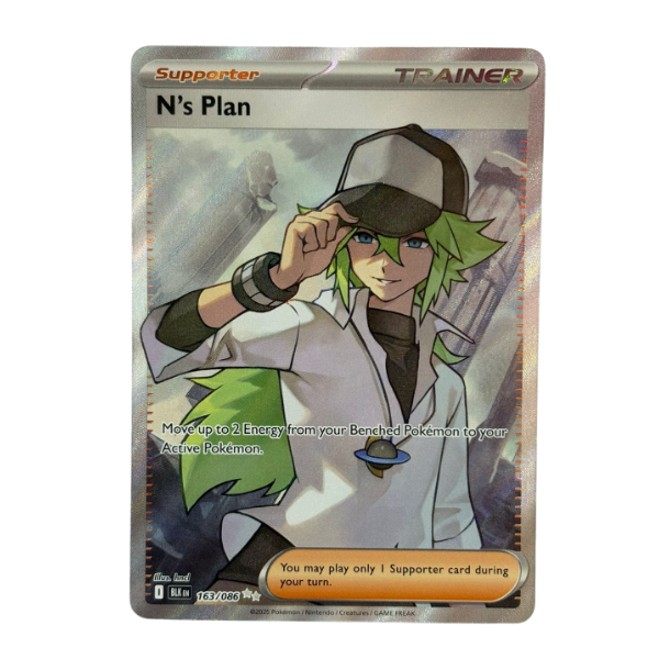 Sumérgete en la mente de uno de los personajes más enigmáticos del mundo Pokémon con N’s Plan, una carta secreta ultra rara de la expansión Black Bolt. Con el número 163/086, esta carta captura toda la intensidad emocional y estratégica de N, plasmando su visión idealista en un diseño visualmente impactante y cargado de simbolismo.